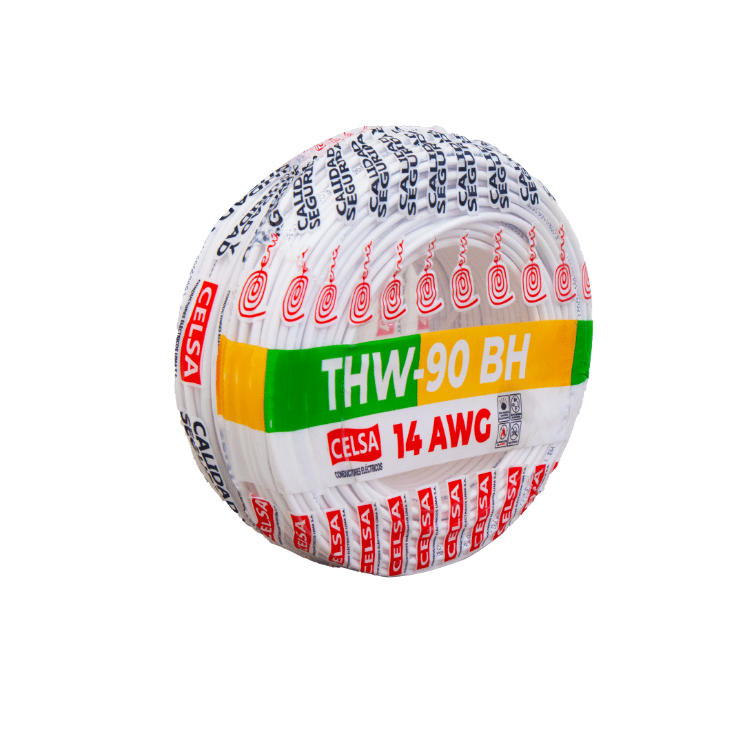 El cable eléctrico Celsa THW-90 BH de 14 AWG en color blanco es de cobre puro y garantiza un rendimiento óptimo y duradero en cualquier aplicación. Para instalaciones fijas, en edificaciones, interior de locales con ambiente seco o húmedo, conexiones de tableros de control y en general en todas las instalaciones que requieran mayor capacidad de corriente al cable TW-80. Su calibre de 14 AWG es ideal para instalaciones de luminarias.